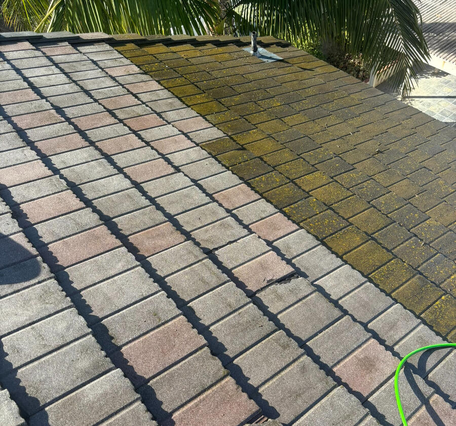 Our process begins by applying a custom, eco-friendly solution to your roof, specifically designed to break down organic growth over time without the use of abrasive scrubbing or high-pressure methods that might harm shingles or tiles. This gentle solution works gradually, activating immediately to start removing contaminants, with full effects appearing over 4 to 8 weeks as natural weathering helps wash away algae, moss, and lichen.During this time, you’ll notice ongoing improvements as the stains naturally diminish, resulting in a clean, refreshed roof. Unlike aggressive pressure washing that can strip protective granules, our slow-release method provides a thorough, non-invasive clean, preserving the roof’s integrity.To ensure optimal results, our team will follow up to monitor progress and address any areas that may need extra care. If needed, we can apply a low-pressure rinse to more stubborn spots, though we prefer to let the solution’s full cycle complete its work. This gentle approach offers a superior clean that won’t compromise roofing materials or warranties.Plus, we include a one-year warranty against algae and moss regrowth!
